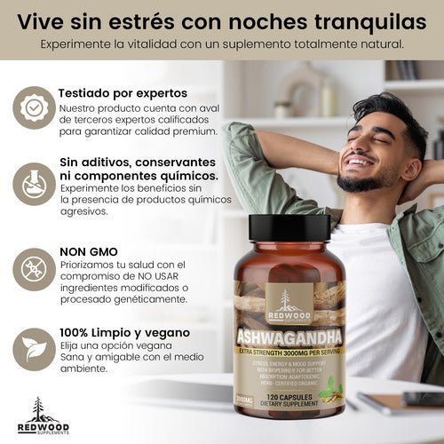 SUPLEMENTO ASHWAGANDHA REDWOOD PAQUETE X3 UNIDADES